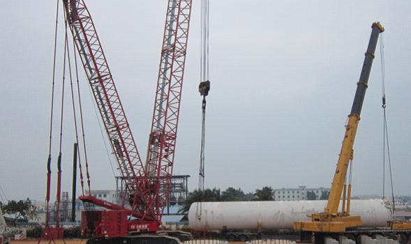 2011年12月21日,華東分公司成功吊裝普萊克斯(海南)中航三鑫PL-3XL機電設備。該項目從12月15日進入設備吊裝安裝階段,項目部針對吊裝設備重量大、現場狹小實際情況,認真組織工程技術和施工作業人員,制定了措施嚴謹施工組織方案。對參與吊裝的機械和輔助設施均認真細致檢驗保養,確保狀態良好。所有項目施工人員集中動員,分工明確、堅守崗位。投入使用400T履帶吊1臺、300T汽車吊1臺、50T及以下吊車3臺,各工種作業人員30多名。經過連續7天的奮戰,至2011年12月21日,將100T以上設備6臺(其中1臺冷箱為140T,高40m)和其他設備共24臺,全部按計劃時間安全吊裝就位,得到了業主的高度好評!