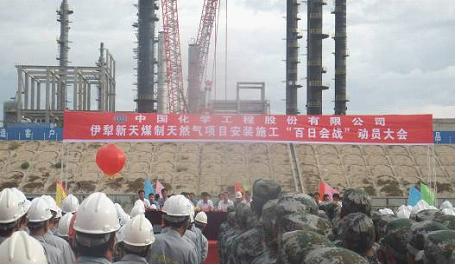 年產20億立方天然氣的伊犁新天項目由山東新汶礦業集團投資興建,中國化學工程股份有限公司實行EPC總承包。目前工程已進入土建向安裝過渡的關鍵時期,全面完成今年安裝施工任務是保證工程實現2014年6月30日機械竣工的前提。適逢新疆施工黃金季節,總承包項目適時吹響了 “百日會戰”的號角。