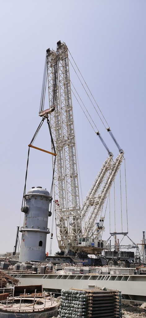 該EO反應器為乙二醇裝置單體最重設備,設備凈重1128噸。江蘇分公司浙石化二期乙二醇裝置項目部施工人員采用由3200噸履帶吊主吊、280噸履帶吊溜尾進行吊裝。經過約2個多小時的起吊、平衡、轉體,上午11點16分順利就位,設備一次吊裝成功。