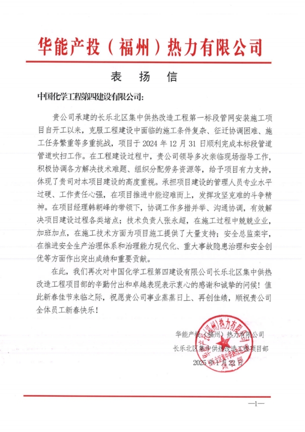 近日,東北公司收到華能產投(福州)熱力有限公司發來的表揚信,對東北公司在項目建設中高質高效完成施工任務給予高度肯定與誠摯感謝。